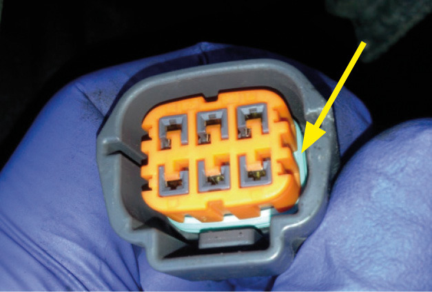 Tester diagnostyczny wskazał otwarty obwód 1. czujnika położenia przepustnicy. Znaleziona zatem została przyczyna świecącej kontrolki. Podczas kontroli połączeń modułu silnika ECU oraz czujnika stwierdzono brak osłony uszczelniającej na złączu czujnika (rys. 4).