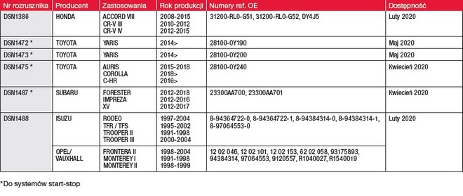 Lista nowości obejmuje 9 alternatorów, które zastępują 37 części OE oraz 6 rozruszników, zastępujących 23 części OE. Nowe podzespoły mogą być montowane w 1,2 miliona pojazdów marek Honda, Jaguar, Lexus, Opel i Toyota.