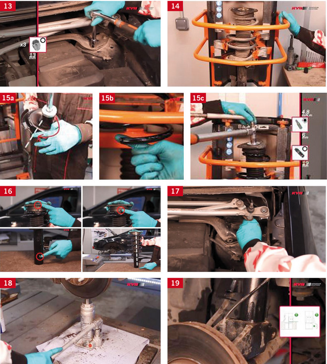 17. Umieścić nowy amortyzator KYB, sprężynę zawieszenia, górny zestaw montażowy oraz zestaw osłonowo-ochronny w kolumnowym ściskaczu pneumatycznym z bramką zabezpieczającą i zmontować całą kolumnę. Górną nakrętkę dokręcić momentem 48 Nm (fot. 15a, 15b, 15c).