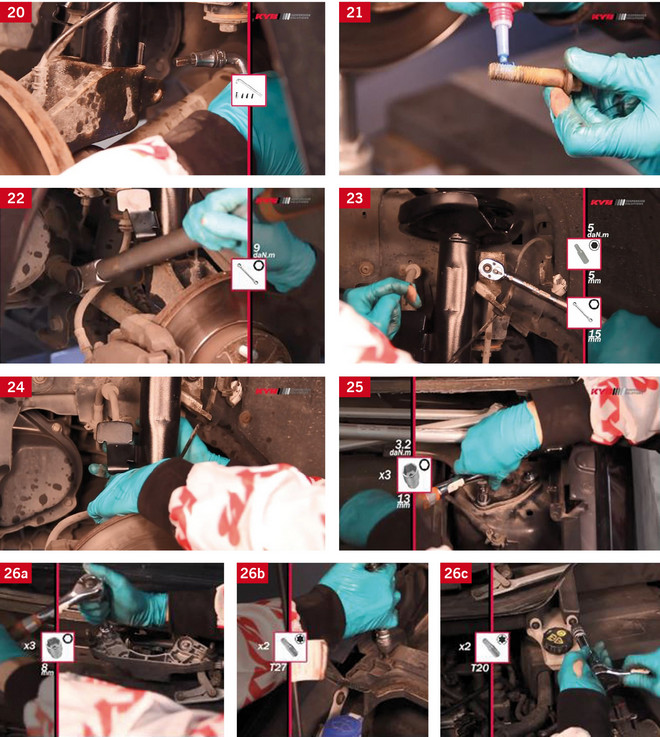 22. Wkręcić śrubę mocującą amortyzator w zwrotnicy, stosując na jej gwint specjalistyczny klej. Śrubę należy dokręcić momentem 90 Nm (fot. 21 i 22).