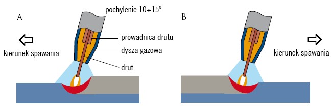 Podczas spawania metodą MAG oraz spawania i lutospawania metodą MIG korzysta się dziś z takich samych, uniwersalnych urządzeń spawalniczych, wyposażonych w uchwyty spawalnicze (końcówki robocze) doprowadzające do łączonego miejsca spoiwo w postaci drutu, napięcie elektryczne i gaz ochronny. Oś geometryczna takiej koncentrycznej końcówki powinna być podczas spawania nachylona względem powierzchni spoiny pod kątem ok. 10°-15°. Można ją prowadzić w lewo lub w prawo, co w przypadku spawacza praworęcznego jest równoznaczne z pchaniem jarzącego się łuku przed układaną spoiną lub jego ciągnięciem w stronę przeciwną.