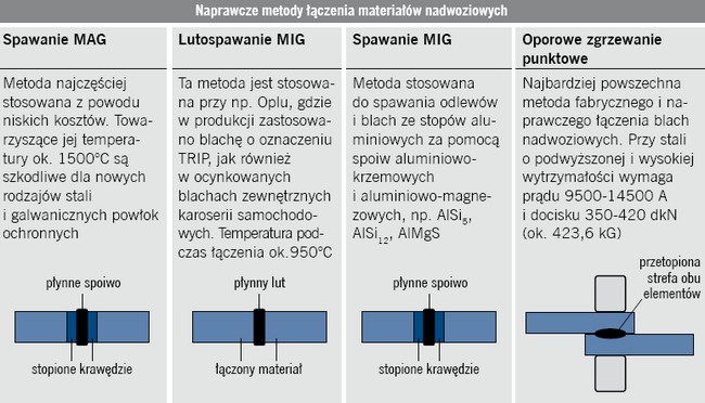 Konsekwencją współistnienia elementów stalowych i aluminiowych w tej samej samochodowej konstrukcji jest radykalna zmiana tradycyjnych technik ich łączenia zarówno w trakcie produkcji nadwozi, jak też ich późniejszych napraw. Wynika ona również ze znacznego postępu w zakresie metalurgii żelaza, dzięki któremu w miejsce uniwersalnych dawniej blach głębokotłocznych pojawiły się w rozmaitych zastosowaniach stale o podwyższonej, wysokiej i ultrawysokiej wytrzymałości.
