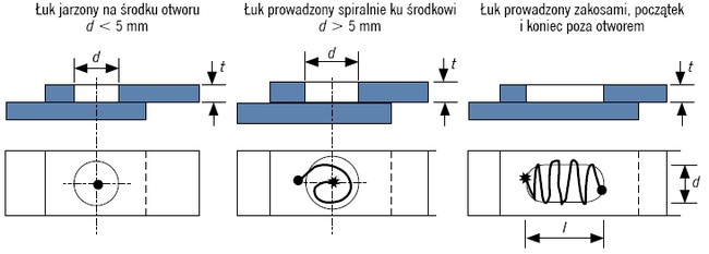 Podczas spawania otworów podłużnych metodą MAG albo ich lutospawania metodą MIG układanie spoiny rozpoczynamy na powierzchni górnej blachy poza obwodem otworu, potem schodzimy do jego wnętrza i wypełniamy go spiralnie ku środkowi, a kończymy znów na powierzchni blachy, po przeciwległej stronie (utrzymując cały czas końcówkę roboczą w pozycji „pchanej”). Powstałe przy tym naddatki spoiwa wymagają później dokładnego zeszlifowania (wstępnie tarczą szlifierską o ziarnistości 60 lub 80 i ostatecznie tarczą o ziarnistości 180).