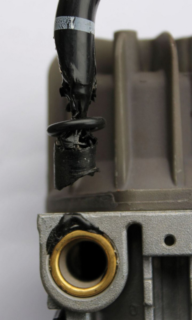 O spaleniu kompresora świadczy zapach spalenizny i/lub odbarwienie metalowej obudowy. Charakterystyczne jest również brązowawe zabarwienie naklejki na kompresorze.