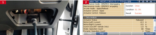 Następnie przy włączonym zapłonie podłącza się tester do 16-pinowego gniazda diagnostycznego i sprawdza ewentualne kody błędów w układach elektrycznego hamulca postojowego i ABS (fot. 1).