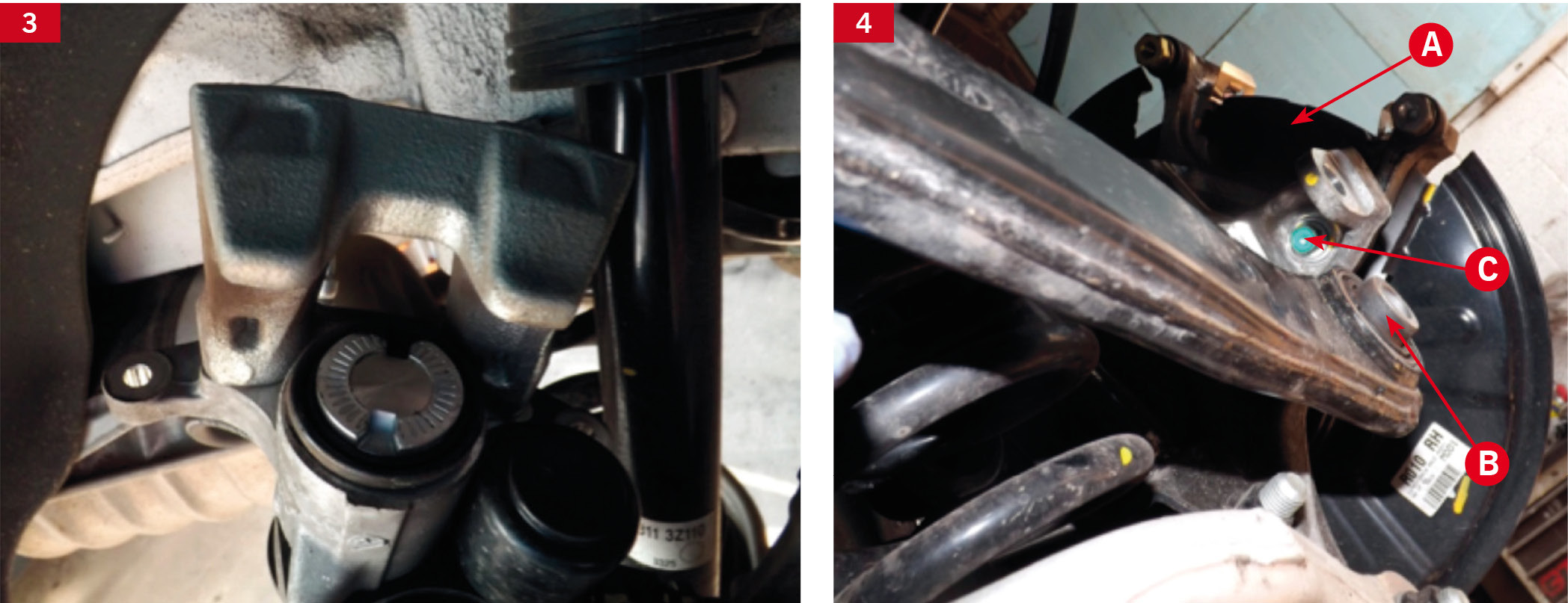 Teraz można usunąć stare klocki hamulcowe i sprężyny mocujące (fot. 4). W celu zdemontowania jarzma zacisku (A) najpierw odkręca się śrubę łącznika zawieszenia (B), co umożliwi odkręcenie dwóch śrub jarzma (C).