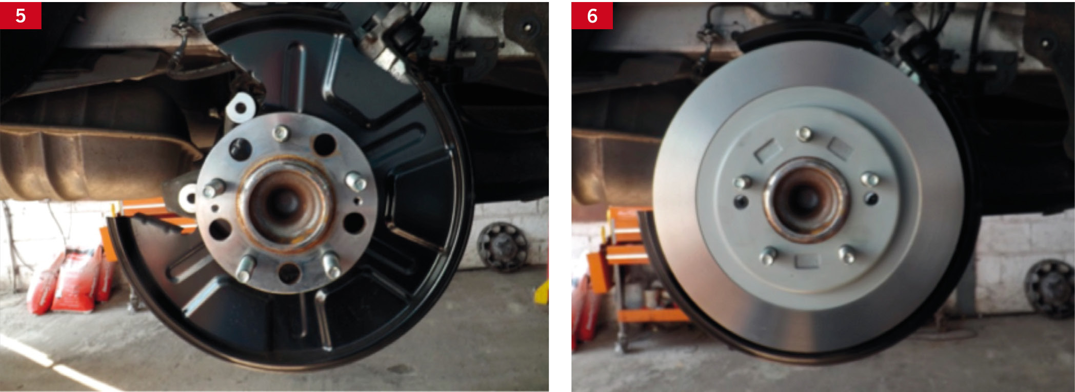 Tylną tarczę hamulcową demontuje się po uprzednim wykręceniu śrub mocujących (fot. 5). Należy pamiętać o konieczności oczyszczenia powierzchni przylegania i w razie potrzeby odtłuszczeniu nowej tarczy przed montażem (fot. 6).