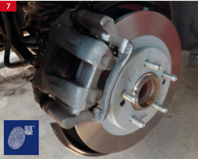 W dalszej kolejności wkręca się śruby jarzma zacisku, śrubę łącznika zawieszenia, po czym zakłada nowe klocki hamulcowe i sprężyny mocujące – wtedy można zamontować zacisk ha-mulcowy (fot. 7).