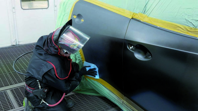 Po przygotowaniu podłoża należy nałożyć czarny lakier bazowy do pełnego krycia, który następnie jest cieniowany na oryginalny lakier. W przypadku mniejszych napraw warto obniżyć ciśnienie w pistolecie, aby uzyskać płynne przejście koloru. Lakier bazowy należy zostawić do całkowitego wyschnięcia, a element – do pełnego ostygnięcia.