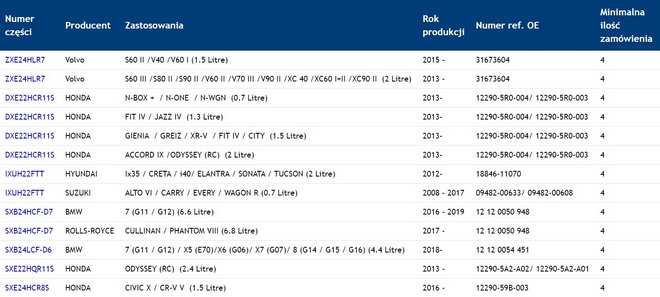 Nowe świece mają 499 zastosowań i zastępują 28 numerów części OE. Można je montować m.in. w pojazdach marek BMW, Honda, Suzuki i Volvo. Listę zastosowań przedstawia tabela niżej.