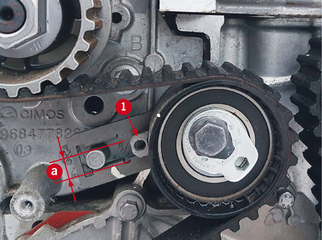 Rys. 10. Napinacz rolkowy paska rozrządu silnika 1.6 HDI DV6 ETED w położeniu roboczym: 1 –wskaźnik napięcia paska rozrządu, „a” – wymiar kontrolny dla położenia wskaźnika napięcia paska rozrządu