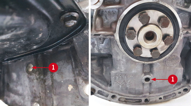 Rys. 2. Miejsce osadzenia blokady układu korbowo-tłokowego silnika 1.6 HDI DV6 ETED: A – widok od strony zewnętrznej silnika, B – widok od strony koła zamachowego, 1 – otwór technologiczny do osadzenia blokady
