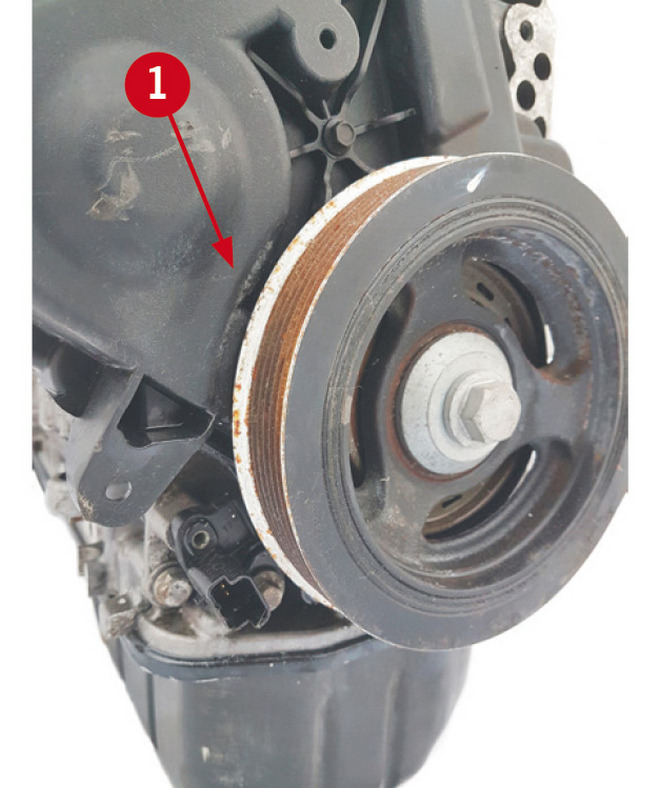 Rys. 3. Lokalizacja czujnika prędkości obrotowej silnika 1.6 HDI DV6 ETED: 1 – czujnik prędkości obrotowej silnika