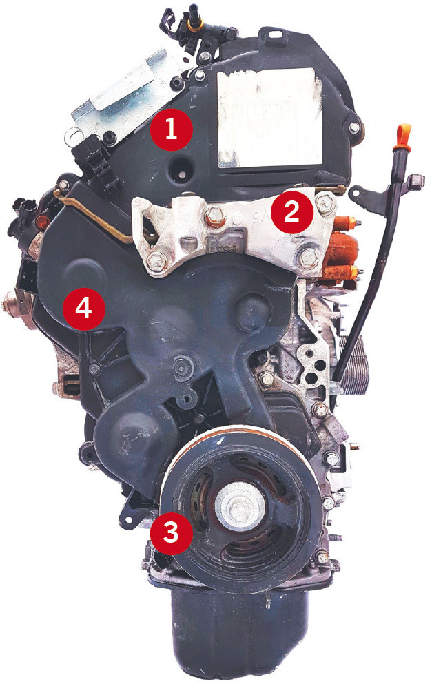Rys. 4. Elementy przeznaczone do demontażu podczas obsługi napędu układu rozrządu silnika 1.6 HDI DV6 ETED: 1 – górna osłona przekładni napędu układu roz rządu, 2 – wspornik prawej łapy mocowania silnika do nadwozia, 3 – koło pasowe napędu osprzętu, 4 – osłona przekładni napędu układu rozrządu
