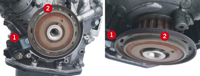 Rys. 5. Czujnik i biegunowy wieniec magnetyczny prędkości obrotowej silnika 1.6 HDI DV6 ETED: 1 – czujnik prędkości obrotowej silnika, 2 – biegunowy wieniec magnetyczny