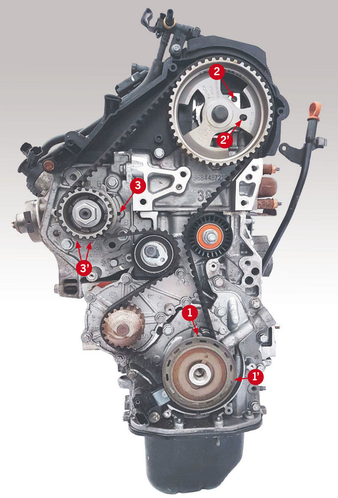 Rys. 6. Punkty korelacji elementów przekładni pasowej napędu układu rozrządu z głowicą i kadłubem silnika 1.6 HDI DV6 ETED: 1 1’ korelacja koła pasowego wału korbowego z biegunowym wieńcem magnetycznym dla czujnika prędkości obrotowej silnika i skrzyni korbowej, 2 2’ korelacja koła pasowego wałka rozrządu i głowicy, 3 3’ korelacja koła pasowego pompy HP i bloku