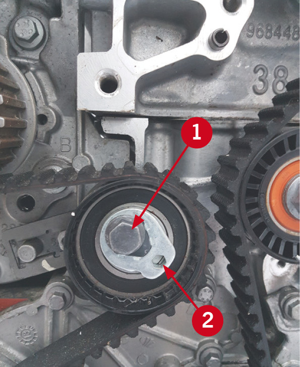 Rys. 7. Napinacz rolkowy paska rozrządu silnika 1.6 HDI DV6 ETED: 1 – śruba mocowania napinacza do silnika, 2 – miejsce osadzenia klucza ampulowego w celu obrotu rolki