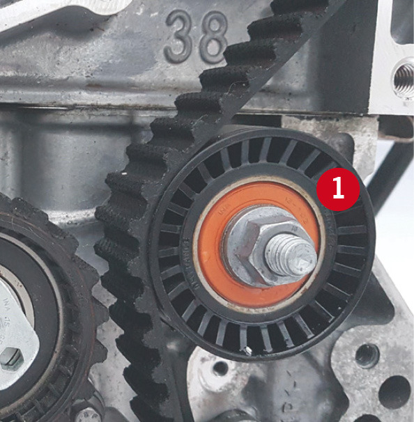 Rys. 9. Rolka prowadząca paska rozrządu silnika 1.6 HDI DV6 ETED: 1 – rolka prowadząca osadzona na osi