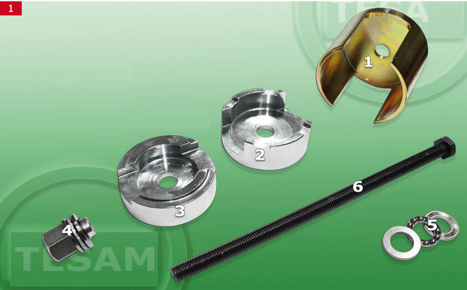 Przyrządu Tesam S0000049 można używać do operacji wymiany tulei wahacza bez konieczności demontażu belki w samochodach Renault Laguna II oraz Peugeot 207.