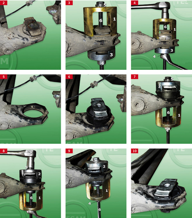 Proces wprasowania nowej tulei przebiega przy odwrotnym ułożeniu adapterów z tym, że zamiast adaptera do wyprasowania (2) należy użyć adaptera do wprasowania (3). Tuleję umieszcza się na gnieździe wahacza tak, jak pokazuje fot. 6. Od dołu przykłada się ściągacz adaptera głównego, a od góry – adapter do wprasowania. Obie części przetyka się śrubą, pamiętając o łożysku ściągacza (5) i zabezpieczeniu nakrętką. Wzajemne usytuowanie adapterów i wciskanej tulei przedstawia fot. 7. Dokręcanie główki śruby spowoduje wciskanie tulei w gniazdo. Proces wprasowania widoczny jest na fot. 8 i 9, a widok prawidłowo zamontowanej tulei – na fot. 10.