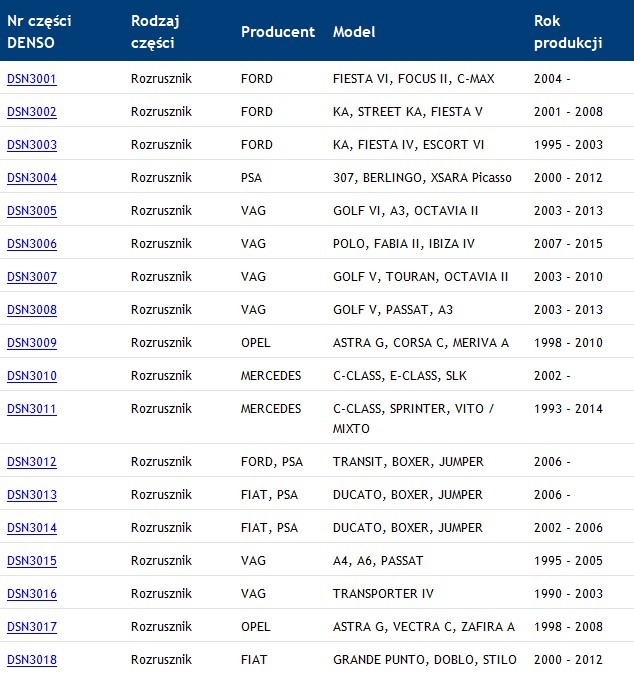 Podzespoły mają 1980 zastosowań i zastępują 256 części OE. Rozruszniki mogą być stosowane w około 49 milionach pojazdów, m.in. marek Citroën, Fiat, Ford, Opel i VW.