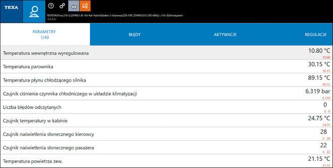 Fot. 2. Podgląd parametrów dla Toyota Prius – układ klimatyzacji