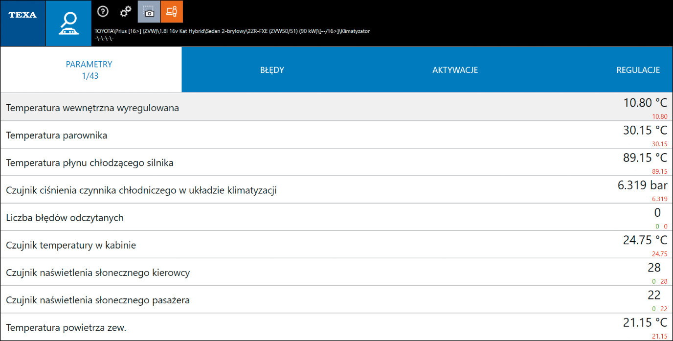 Przykładowe aktywacje i parametry przedstawiamy na przykładzie samochodu Toyota Prius – kod modelowy ZVW z 2016 roku, wykorzystując oprogramowanie diagnostyczne firmy Texa IDC5 oraz interface diagnostyczny TXT Multihub. Dla tego pojazdu dostępne są w diagnostyce 43 parametry, dzięki którym można sprawdzić, czy któryś czujnik pokazuje niewiarygodne wartości. Prawidłowa interpretacja danych wymaga doświadczenia, ponieważ czujnik pokazujący błędną wartość (mieszczącą się jednak w zakresie pomiarowym przewidzianym w oprogramowaniu) nie wygeneruje kodu usterki, lecz spowoduje nieprawidłowe działanie układu. Przykładowo, przy uszkodzonym czujniku temperatury zewnętrznej zaniżającym wartość pomiaru, klimatyzacja będzie działała mało wydajnie. Fot. 2 przedstawia przykładowe parametry dostępne w oprogramowaniu.