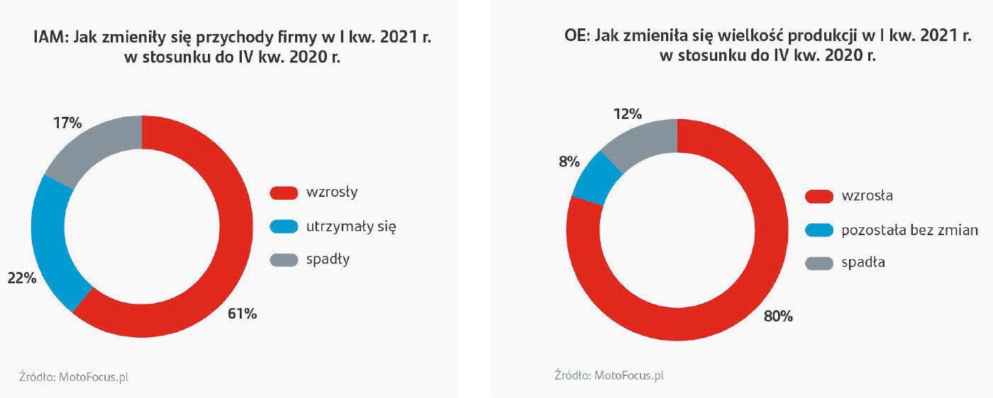 Dane publikowane w kwietniu br. przez Główny Urząd Statystyczny pokazują, że produkcja przemysłowa w marcu 2021 r. wzrosła o 18,9% w ujęciu rocznym, czyli znacznie więcej niż wynosiły przewidywania analityków. Oznacza to, że poziom produkcji w polskim przemyśle był w tym miesiącu powyżej trendu sprzed pandemii. Te dobre wiadomości potwierdzają producenci części motoryzacyjnych. 61% ankietowanych przedsiębiorstw dostarczających części na rynek wtórny (IAM) wskazuje na wzrost przychodów w I kwartale br. w porównaniu z ostatnim kwartałem 2020 r. W tym samym okresie aż 80% producentów asortymentu na pierwszy montaż (OE) odnotowało wzrost produkcji. Trzeba mieć jednak na uwadze, że te optymistyczne wyniki są w dużej mierze skutkiem wciąż niskiej bazy z IV kwartału 2020 r.