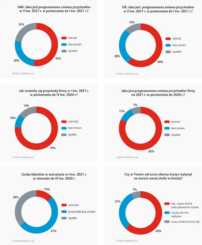 Mimo wspomnianych problemów prognozy na kolejny kwartał są optymistyczne. 52% producentów części na rynek wtórny oraz 60% producentów części na pierwszy montaż spodziewa się wzrostu przychodów w porównaniu z I kwartałem br., w którym większość ankietowanych producentów już odnotowała wzrosty przychodów i produkcji.