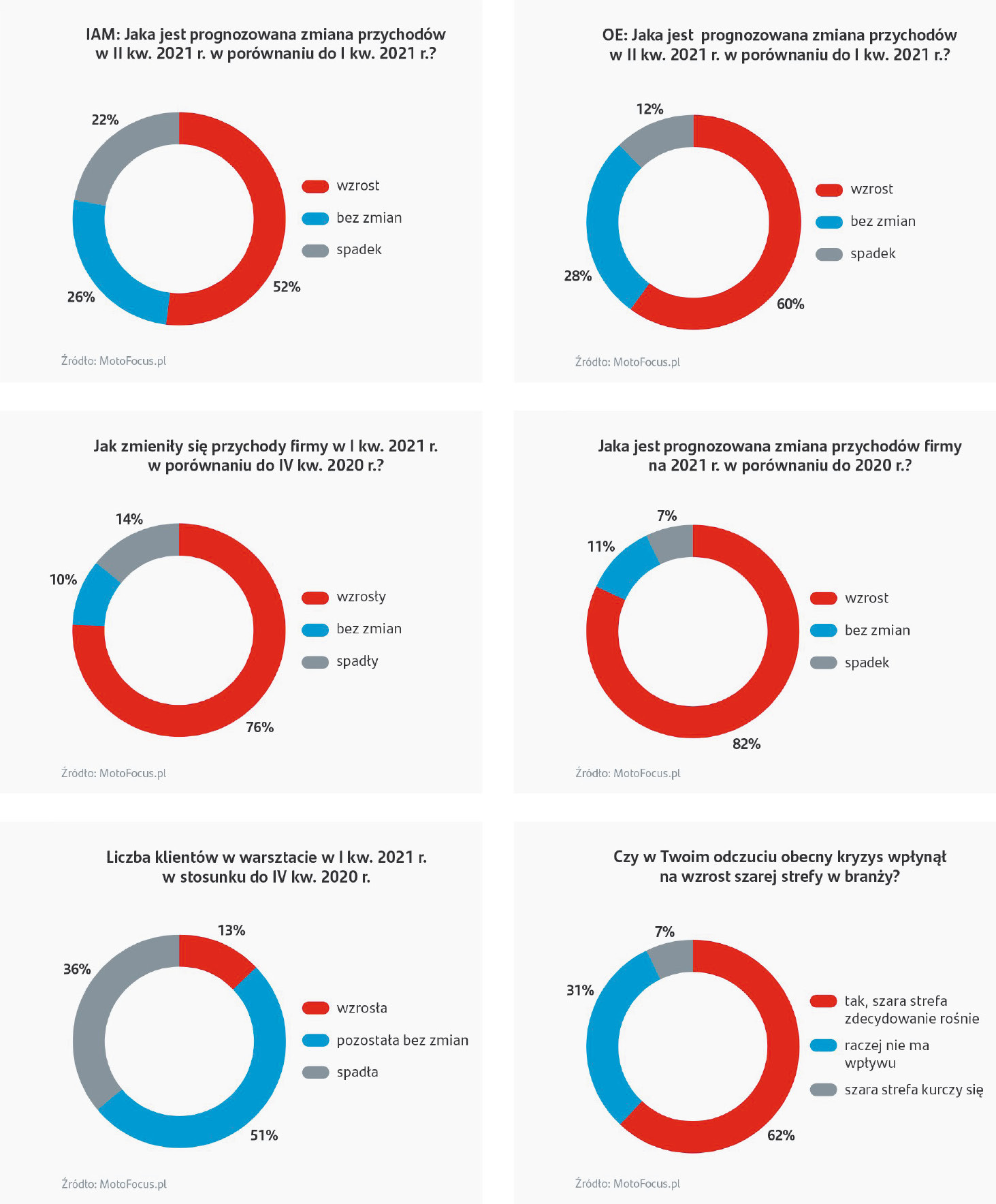 Mimo, że w kryzysie nie kupuje się nowych samochodów, a raczej naprawia i serwisuje się te już używane, nie przysporzyło to warsztatom tłumów klientów. Ponad jedna trzecia badanych przedstawicieli warsztatów wskazała, iż liczba klientów w I kwartale 2021 r. spadła w porównaniu z ostatnim kwartałem 2020 r., a jedynie 13% zanotowało wzrost. Ze względu na lockdown, pracę zdalną i izolację społeczną wiele osób ograniczyło przemieszczanie, a tym samym – korzystanie z samochodów, co znacząco zmniejszyło potrzeby serwisowania pojazdów. Dodatkowo bolączką sektora pozostaje szara strefa – aż 62% respondentów zauważa jej wzrost spowodowany kryzysem wywołanym pandemią.