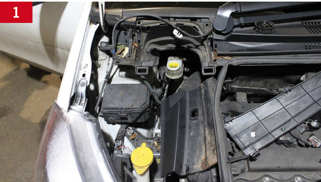 2. Otwórz maskę i zdejmij dolne listwy przedniej szyby, aby uzyskać dostęp do akumulatora i zbiornika płynu hamulcowego (fot.1).