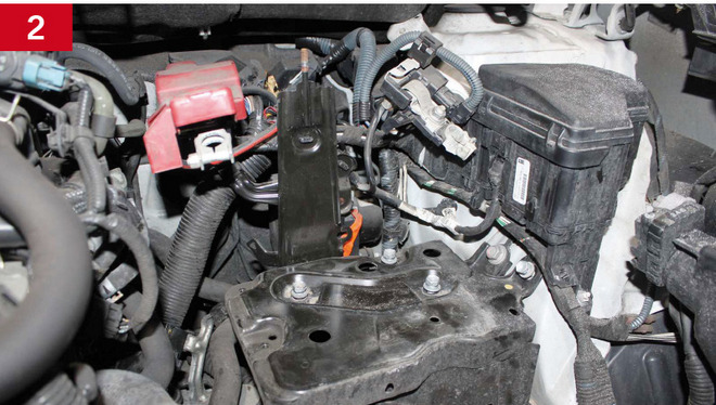 3. Odłącz akumulator, zdejmij zacisk akumulatora, następnie wyjmij akumulator i jego podstawę akumulatora. Zapewni to dobry dostęp do górnej części skrzyni biegów.