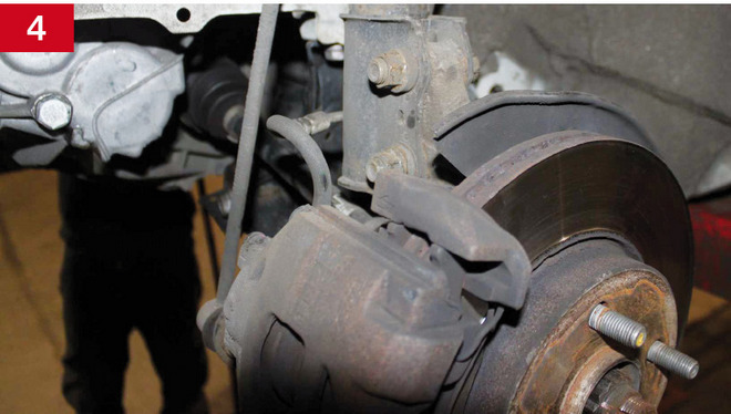 7. Unieś samochód na podnośniku, by uzyskać dostęp do spodu pojazdu. Zdejmij osłonę podsilnikową, a następnie spuść olej ze skrzyni biegów. Podczas spuszczania oleju opuść auto i zdejmij oba przednie koła, odłącz przednie łączniki stabilizatora od drążka stabilizatora i odkręć dwie śruby, które łączą amortyzator z zespołem piasty (fot. 4). Wyjmij półoś napędową ze skrzyni biegów i odsuń ją, by nie przeszkadzała w dalszej pracy.