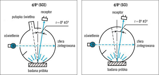 Głowica pomiarowa tego przyrządu korzysta z tzw. kuli Ulbrichta, która jest wydrążona i ma białe wnętrze. Wiązka światła skierowana do kuli jest doskonale rozpraszana przez wewnętrzną powierzchnię o bardzo dużym współczynniku odbicia i równo oświetla powierzchnię mierzonej próbki. Bez względu na to, jak powierzchnia rozprasza odbite światło, jest ono całkowicie gromadzone ze wszystkich stron wewnątrz kuli i mierzone za pomocą czujnika ustawionego pod kątem 8o względem osi prostopadłej. Ponieważ połysk jest całkowicie ujęty w pomiarze, przyrząd sferyczny ignoruje różnice wyglądu i „widzi” tę samą barwę na próbce lśniącej, matowej czy o dowolnej innej teksturze. Innymi słowy, sferyczna geometria pomiarowa stosowana w trybie SCI (tj. przy składowej lustrzanej włączonej) kładzie nacisk na pigmentację mierzonej próbki i powinna być wybierana do zadań związanych z recepturowaniem barw.