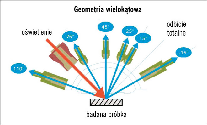 Wiele dostępnych na rynku produktów wysokiej klasy wyróżnia się dzięki zastosowaniu kolorów specjalnych z efektem łuski metalicznej oraz pigmentu perłowego lub interferencyjnego. Powierzchnie te potrafią wywrzeć znaczny wpływ na ogólną prezencję produktu. Niestety, ani przyrządy z geometrią pomiarową kierunkową, ani ze sferyczną – nie dostarczają wiarygodnych danych do przeprowadzenia korekty. Farby dające efekty specjalne zmieniają barwę i wygląd w zależności od kąta obserwacji, dlatego muszą być mierzone przy zastosowaniu wielokątowej geometrii pomiarowej. W standardowej konfiguracji taki system oświetla mierzony przedmiot pod kątem 45° względem osi prostopadłej, natomiast kąty detekcji są umieszczone na tej samej płaszczyźnie na 15°, 25°, 45°, 75° i 110°. Kąty te są uważane za aspekularne (nielustrzane) i są pobierane z kierunku odbicia lustrzanego.