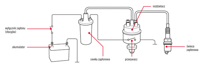 Akumulator dostarcza prąd o napięciu 12 V do cewki zapłonowej poprzez wyłącznik zapłonu (stacyjkę). Prąd płynie przez uzwojenie pierwotne cewki, a następnie do masy uziemienia poprzez przerywacz. Sprężyna stanowiąca część zespołu przerywacza utrzymuje styki w pozycji zamkniętej, co umożliwia przepływ prądu przez uzwojenie pierwotne cewki. Następnie przepływ prądu wytwarza pole magnetyczne wokół uzwojenia pierwotnego i wtórnego.