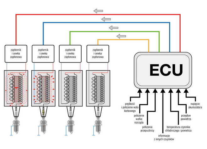 Rys. 10. Bezrozdzielaczowy elektroniczny układ zapłonowy sterowany przez jednostkę sterującą silnika