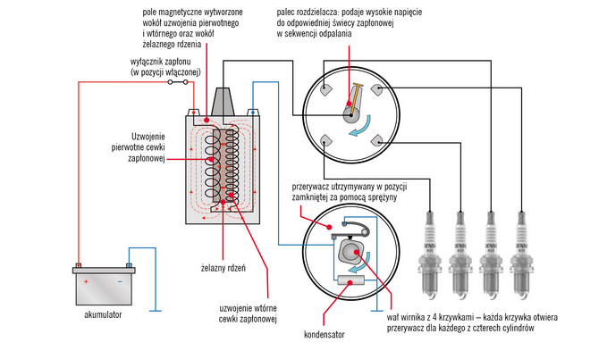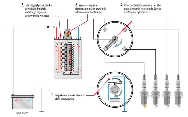 Rys. 3. Działanie podstawowego mechanicznego układu zapłonowego. Etap 2 – rozładowanie wysokiego napięcia w celu wytworzenia iskry