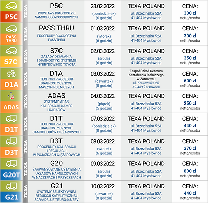 D3T – Procedury kalibracji i regulacji w pojazdach ciężarowych - po ukończeniu szkolenia uczestnik będzie potrafić m.in. interpretować wyniki testów diagnostycznych w silnikach Iveco Cursor oraz Tector; pozna procedurę regulacji elektronicznych po wymianie komponentów takich jak wtryskiwacze, pompa paliwa, elektroniczny osuszacz. Przeprowadzona zostanie interpretacja: klasyfikacji wtryskiwaczy, resetowania filtra osuszacza w Volvo, wymiana APM w Renault i inne.