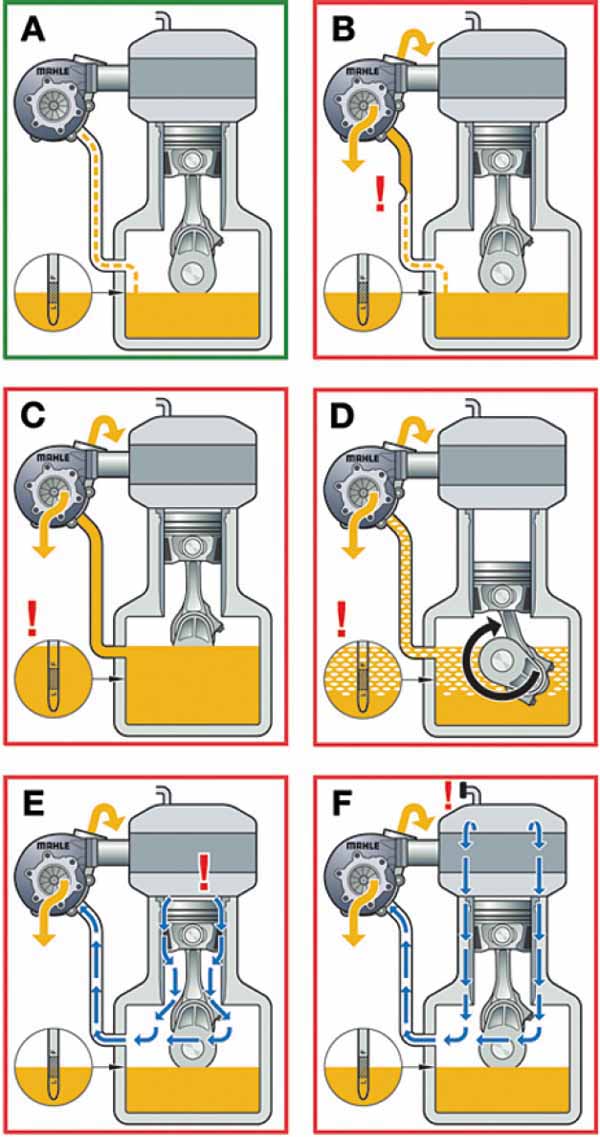 Brud, sadza, paliwo, woda, pozostałości spalania lub starte drobinki metalowe mogą zanieczyścić olej. Ze względu na bardzo wysoką prędkość obrotową turbosprężarki nawet najmniejsze cząstki obce w oleju szybko doprowadzają do jej poważnego uszkodzenia.