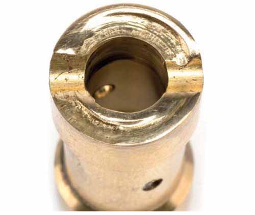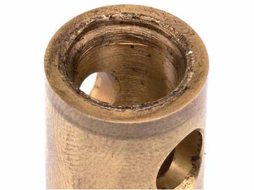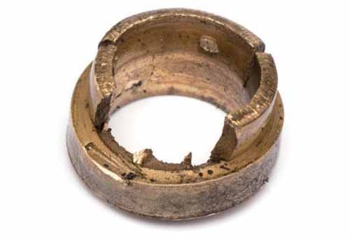 - Na wałku widoczne są wyraźne zmiany koloru (fot. 3). Powstają one na skutek tarcia i spowodowanej przez nie wysokiej temperatury pomiędzy wałkiem i łożyskami. Przyczyną jest brak smarowania. Gdy temperatura przekroczy określoną wartość, następuje napawanie materiału łożyska na wałek (fot. 4) lub zespolenie tulei łożyskowej z wałkiem.