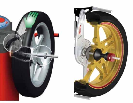 Dokładność centrowania: wyważarka do kół osobowych wyposażona w uchwyt motocyklowy sprawia, że koło motocyklowe jest zamocowane za pomocą ramion zaciskowych, blokujących je poprzez kontakt z zewnętrzną krawędzią opony. Taki sposób mocowania zmniejsza dokładność wyważenia ze względu na możliwość wystąpienia drgań wynikających z nieprawidłowego centrowania koła. Wyważarka motocyklowa ma nieruchomy wałek do mocowania koła, który idealnie odzwierciedla warunki jego toczenia na osi motocykla przy równoczesnym idealnym centrowaniu koła na wałku wyważarki.