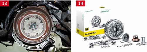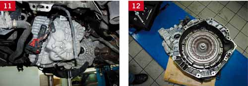 Teraz można odkręcić śruby i zdemontować skrzynię biegów. Należy pamiętać o jej znacznej masie, charakterystycznej dla wersji dwusprzęgłowej, gdzie sprzęgło jest zamontowane wewnątrz skrzyni (fot. 11 i 12).