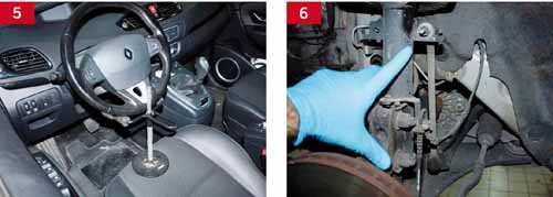 Dalsze czynności prowadzimy na podniesionym samochodzie z odkręconymi kołami. Demontujemy nadkole po lewej stronie, odkręcamy łącznik stabilizatora, końcówkę drążka kierowniczego i sworzeń wahacza, zabezpieczamy ramę pomocniczą (sanki) wspornikiem hydraulicznym i odkręcamy śruby mocujące pomocniczą ramę podsilnikową (fot. 6 i 7).