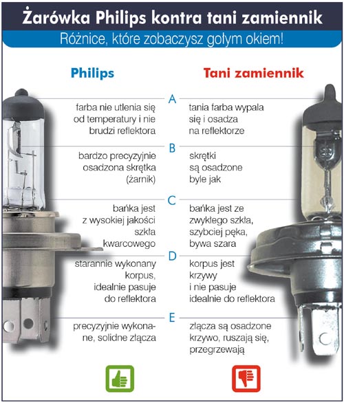 Dodatkową przewagą markowej żarówki Philipsa nad tanim odpowiednikiem jest seryjne zastosowanie filtra UV, który chroni reflektor oraz klosz przed odbarwieniami.