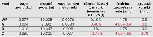 Wyniki przedstawione w tabeli 1 są bezlitosne, bo jednoznacznie pokazują, jak powstają oszczędności w tej grupie produktowej. Rurki „A” i „C”, zmniejszając jedynie grubość ścianki, oferują od 8 do prawie 11% mniej materiału w produkcie. W dodatku tam, gdzie grubość ścianki była mniejsza niż 0,9 mm, produkty nie zawsze utrzymywały okrągły kształt przekroju rurki na całej jej długości. Wada ta jest niebezpieczna, gdyż może znacząco osłabiać wytrzymałość produktu w miejscach zwężenia.