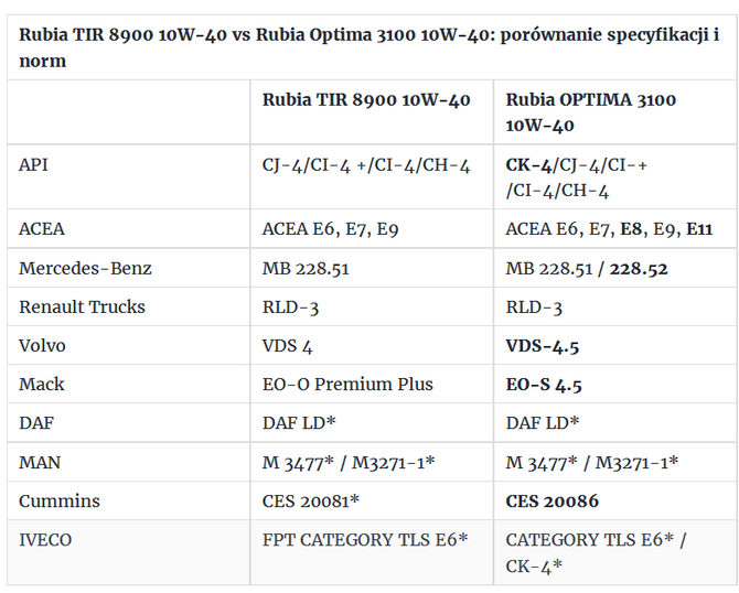 Oto porównanie norm najnowszego oleju Rubia OPTIMA 3100 FE 10W-40 z poprzednikiem Rubia TIR 8900 10W-40: