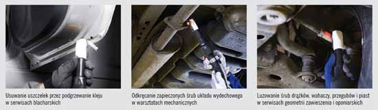 Mobilny podgrzewacz indukcyjny firmy Snap-on przeznaczony jest dla warsztatów blacharskich np. do naprawy wgnieceń karoserii (również aluminiowych), usuwania resztek kleju po uszczelkach oraz do warsztatów samochodowych podczas luzowania śrub drążków, wahaczy, przegubów lub piast.