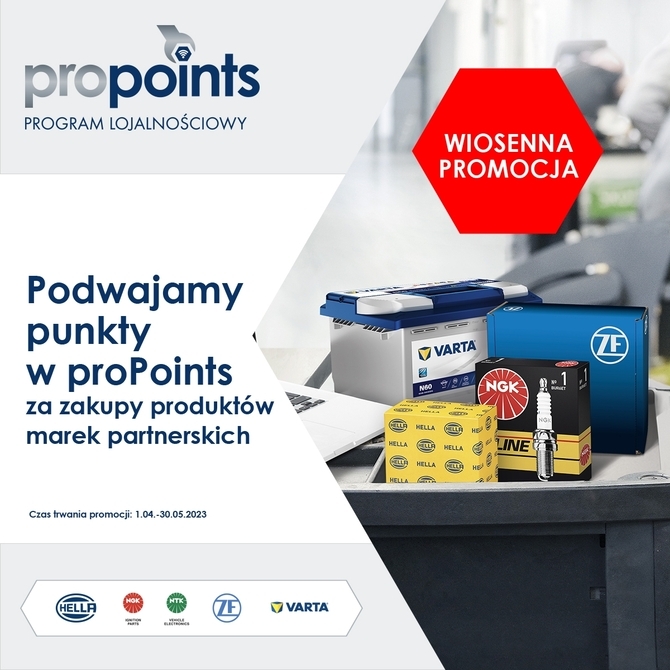 Trwa promocja programu proPoints, która w kwietniu i maju za zakup produktów marek partnerskich: Hella, Hella Pagid, Niterra (NGK, NTK), Sachs, Lemförder, TRW, ZF i Varta, umożliwia otrzymanie podwójnych punktów.
