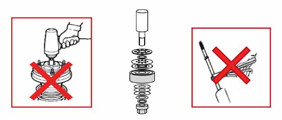 Podczas dokręcania nakrętki trzpienia tłoczyska nie należy używać klucza udarowego. Ta, niestety często stosowana praktyka warsztatowa jest bezpośrednią przyczyną uszkodzeń i związanych z tym reklamacji. Klucz udarowy przez generowane drgania może zmienić charakterystykę pracy amortyzatora, wpływając na zmianę koncentrycznie ułożonych płytek górnego zespołu zaworowego, powodować powstawanie stuków oraz być przyczyną jego krótkiej żywotności lub wręcz uszkodzenia. Podczas montażu amortyzatorów nie zaleca się także używania szczypiec zaciskowych do przytrzymywania tłoczyska podczas dokręcania nakrętki trzpienia, ponieważ doprowadza to do uszkodzenia powierzchni chromowej, a w następstwie – do uszkodzenia uszczelniacza i wycieku oleju z amortyzatora.